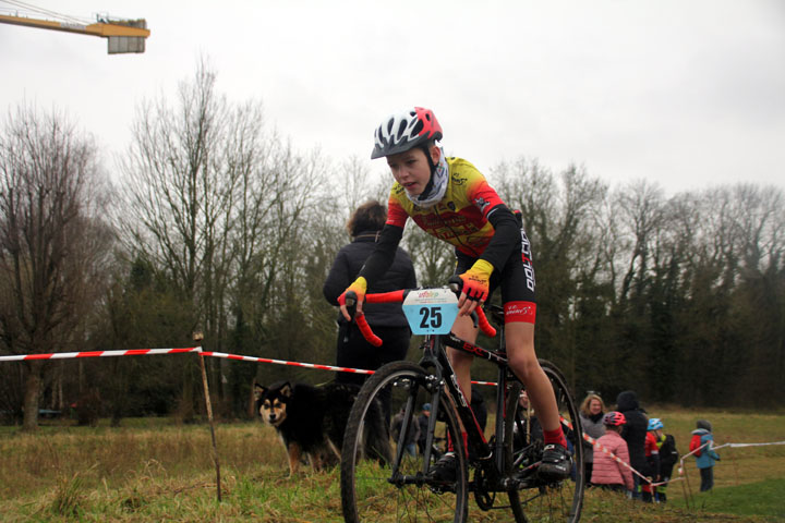 A 2 tours de l’arrivée, nouvelle situation de course avec une belle attaque de Nohan Delalleau qui va s’envoler à l’avant rejetant à quelques longueurs Jade Baptiste et Romain Quillot ( EC Héninoise )