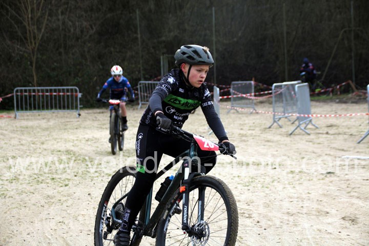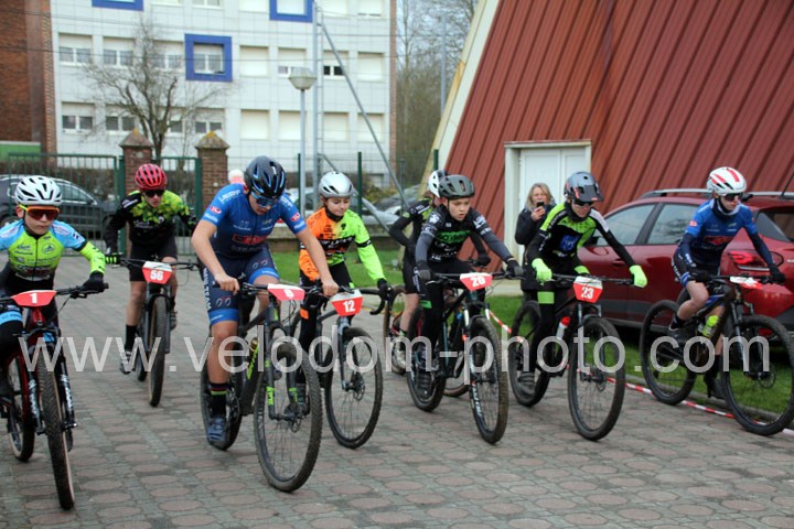 Ce sont 11 coureurs qui se lancèrent dans la grande bagarre. Très vite la course va se dessiner avec dans le 1er tour, deux coureurs qui vont se distinguer : Mathéo Rivart ( VTT Pontois ) et Lyam Thorlet ( VC Escaut Anzin ) qui vont devancer de quelques longueurs Timeo Finet ( New Team Maulde ).