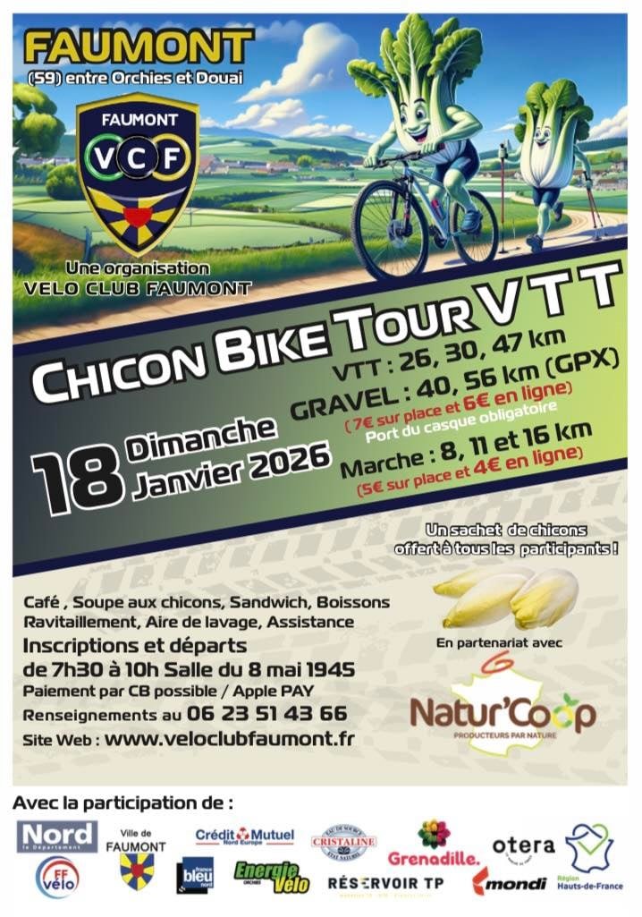 Après le beau succès de l’an dernier avec 1435 participants, toute l’équipe du Vélo Club de Faumont autour du Président Denis Raton vous attend pour ce grand rendez-vous de ce début d’année : la Chicon Bike Tour avec de très beaux circuits VTT et Marche et cette année encore deux parcours Gravel notamment les montées du Terril de Leforest et d’Evin Malmaison. Ce sera le 18 Janvier prochain au départ de la Salle des Fêtes de Faumont. Une belle matinée sportive en perspective placé sous le signe du Chicon. Car chacun des participants pourra repartir avec son sachet de chicons sans oublier la dégustation de la bonne soupe de chicons au retour des inscrits. Alors le 18Janvier, tous à Faumont