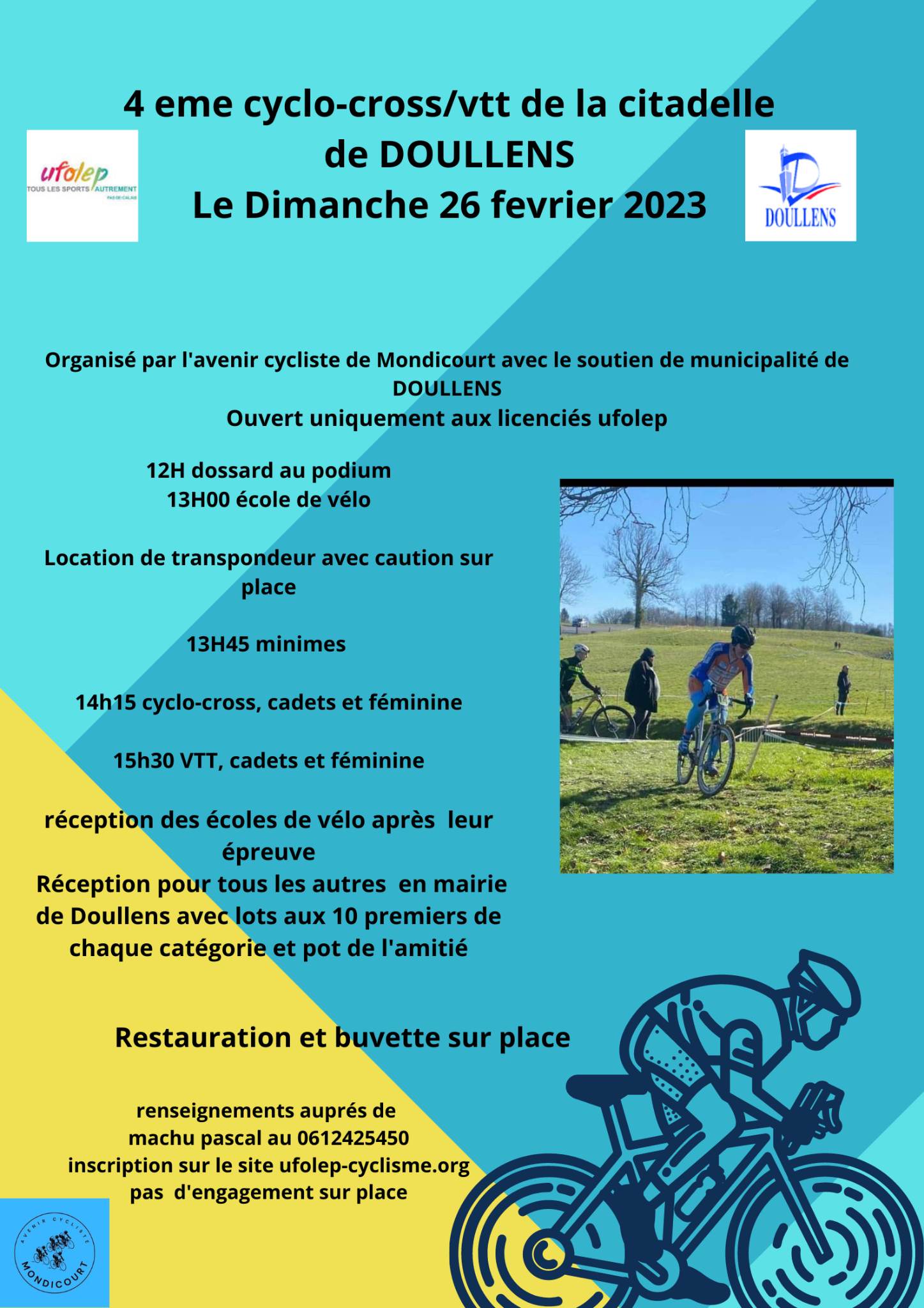 La 4 éme édition du cyclo-cross vtt de la citadelle de Doullens aura lieu ce dimanche 26 février 2023 ouverte aux licenciés UFOLEP. La 1ére édition avait eu lieu en 2019 sous l’initiative de Pascal Machu qui en arrivant sur Doullens en tant que nouvel habitant a eu l’idée de relancer cette manifestation ou il y avait eu dans le passé des épreuves dont un championnat national ufolep de vtt. N’ayant plus d’organisation après cela , Pascal a donc eu l’idée il y a 5 ans de remettre l’épreuve au goût du jour sur ce magnifique site qu’est la citadelle de Doullens.