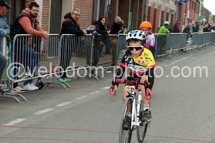 C’est un beau peloton de Benjamins qui s’élança dans cette 2ème épreuve de la journée. Si le 1er tour sera plus calme. Il faudra attendre le 2ème tour pour voir se développer les 1ères attaques. En effet, deux coureurs vont sortir le grand jeu. Simon Hauw ( Barlin ) et Clément Bienfait ( TCSP 59 ). Deux coureurs qui vont se livrer un beau duel et allait se jouer la victoire. En effet, au fil des tours, ils vont creuser l’écart. Derrière la poursuite sera à l’actif de Charlie Druart ( Flines lez Mortagne ).