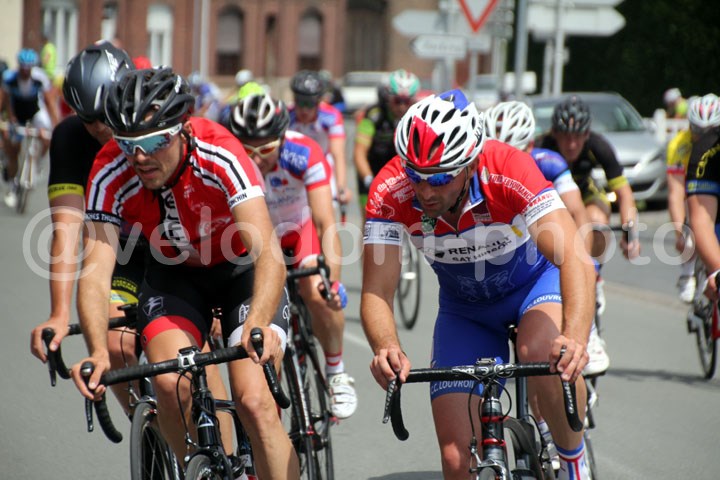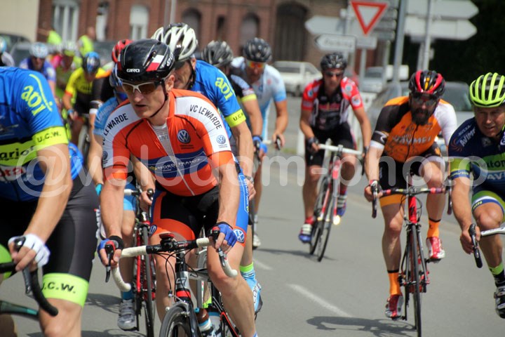 C’est un beau peloton de 2ème catégorie qui aborda cette 1ère épreuve de la journée. Après un 1er tour groupé, le 2ème tour marquera la 1ère échappée du jour avec Yohann Vangenechten ( VCU Halluin ) et un coureur de Lieu St Amand. Mais le peloton restait vigilant à l’arrière et prêt à rebondir. Dans le 3ème tour, nouvelle situation de course avec cette fois 3 hommes en tête : Jean François Couillet ( St André ), Guiseppe Cinquana ( Team Bavay ) et Geoffrey Vanacker ( Team Bermerain ).  Quelques instants plus tard, ils seront rejoints par de solides rouleurs comme François Hennocq ( St André ), Pascal Bertin ( La Chérizienne ),  Thomas Montaigne ( La Chérizienne ), Arnaud Sauvage ( VC Anzin Escaut ) et Laurent Castiglionetti ( CC Orchies ). Ils seront alors 8 en tete de course. Ce sera la bonne. L’échappée roulera de concert et creusera l’écart même si derrière on ne s’avouera jamais vaincu à l’image de Frédéric Stievenart ( St André ), Herve Bourgeois ( EC Feignies ) et Frédéric Potier ( EC Tourcoing ).