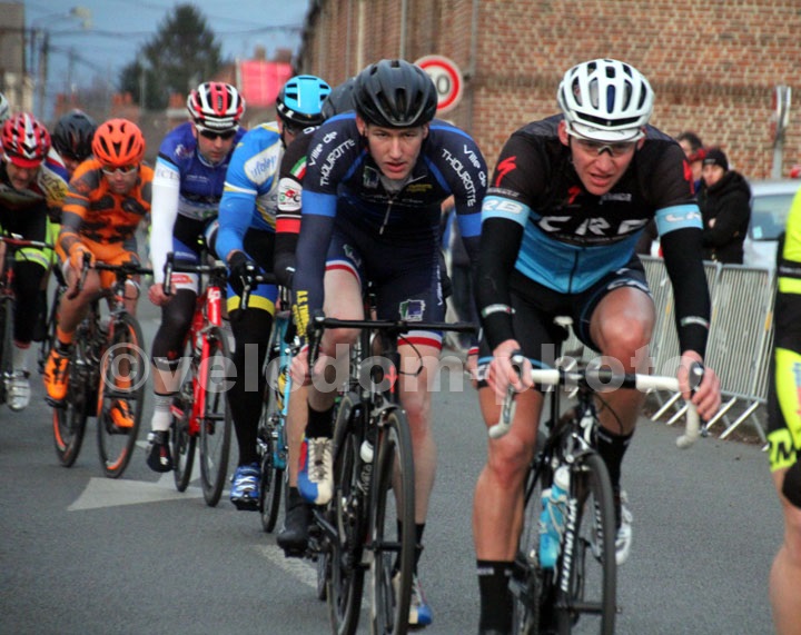 Comme on dit toujours, le plus fort à gagner. On peut le dire une fois de plus pour les 1ères catégories qui nous ont offert un festival d’attaques. Le départ donné, on assistait déjà aux 1ères attaques à l’actif du Tourquennois Thibaut Delmeulle. Mais derrière on restait vigilant et on retrouvait un Eric Allart ( ESC Bully ) très actif en tête de peloton. Quelques instants plus tard, tout rentrait finalement dans l’ordre mais ce n’était que partie remise avec une belle entrée en action de deux coureurs : Florian Lindauer ( Thourotte ) et Guillaume Lenglet ( Boue ). Derrière des deux redoutables compétiteurs, on sentit vite le danger et c’est Mickael Lamerand ( VCU Halluin ) qui faisait le forcing pour revenir sur les leaders. Nous n’étions finalement pas au bout de nos surprises puisque dans le 4ème tour, 2 autres concurrents prenaient place en tête de course avec Eric Allart ( ESC Bully ) et Yohann Morelle ( Lieu St Amand ). Différentes actions qui auront permis de faire le ménage dans le peloton et crée plusieurs groupes. Devant, ca bougeait une fois de plus quelques instants plus tard avec cette fois Jérome Hurez ( Anzin ) qui revenait dans le sillage d’Allart. Commençait alors une belle partie de manivelles entre les deux hommes qui durera plusieurs tours mais derrière les réactions furent très vives et tout rentrait dans l’ordre à l’amorce du final. Un trio se dégagea alors. Ce serait la bonne. Un groupe composé de Thomas Leclerc ( Thourotte ), Michael Lamerand ( VCU Halluin ) et Julien Leclercq ( Team 2 Méricourt ). Dans la dernière droite, Julien Leclercq fera voir sa belle pointe de vitesse et s’imposera devant Thomas Leclerc et Michael Lamerand. Quelques instants plus tard, Julien Blondiaux ( Marcoing ) prenait une belle 4ème place devant Yohann Morelle ( Lieu St Amand ).