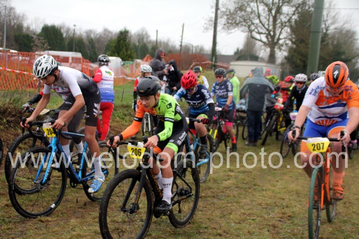 Chez les cadets cyclo cross, la course va rapidement prendre son élan avec un coureur qui va faire la différence avec Jacques Desgrousilliers ( Team Pink and Blue ) qui va parvenir à prendre quelques longueurs à LOny Alexandre ( VC Solesmes ) et Noham Vin ( Team Cycliste La Bordure ).