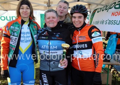 Elles seront quatre chez les féminines à se battre pour la victoire. D’entrée c’est Laurence Garot ( Team Shark ) qui se montrera conquérante en s’installant seule en tete de la course. Derrière on retrouvait en poursuite Maggy Alexandre ( VC Solesmes ) et Lucie Dumont ( Isbergues ), c’est dans cet ordre que l’on retrouvera les concurrentes à l’arrivée avec la belle victoire de Laurence Garot devant Maggy Alexandre et Lucie Dumont
