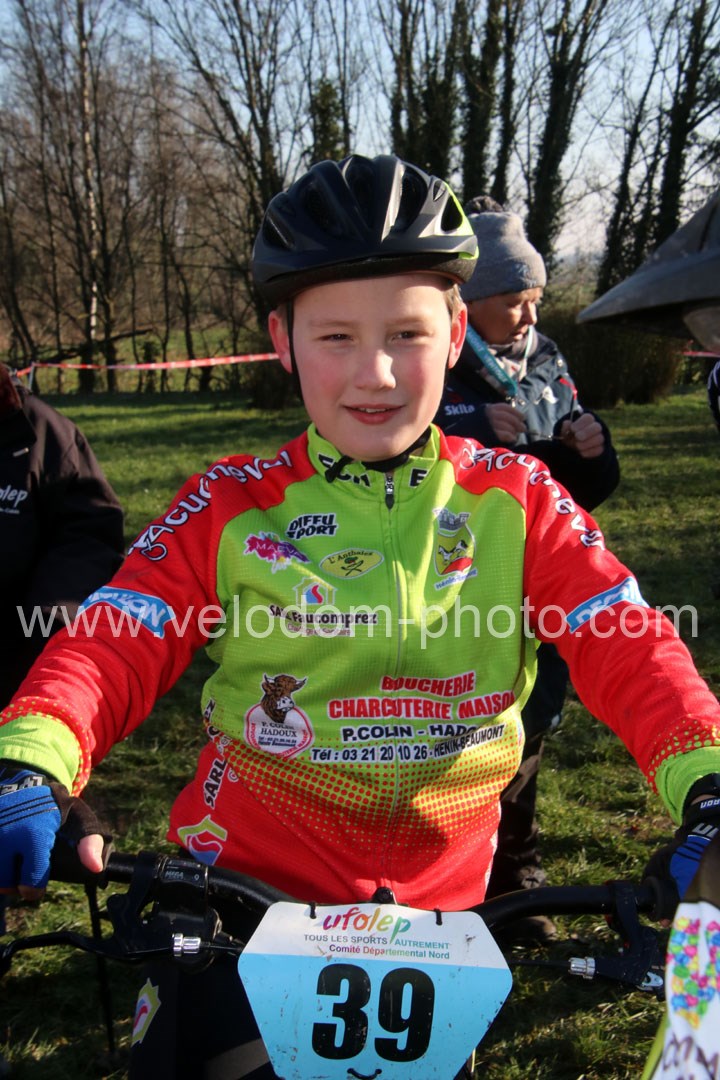 Ce sont 5 coureurs qui engagèrent les hostilités chez les poussins. Très vite on entrait dans le vif du sujet avec une belle attaque de Tim Codeville ( Wambrechies Marquette ) qui le plaçait seul en tête de la course. Derrière et en poursuite, on retrouvait Romain Quilliot ( EC Héninoise ) et Maxence Guillon ( CC Bapaume ).