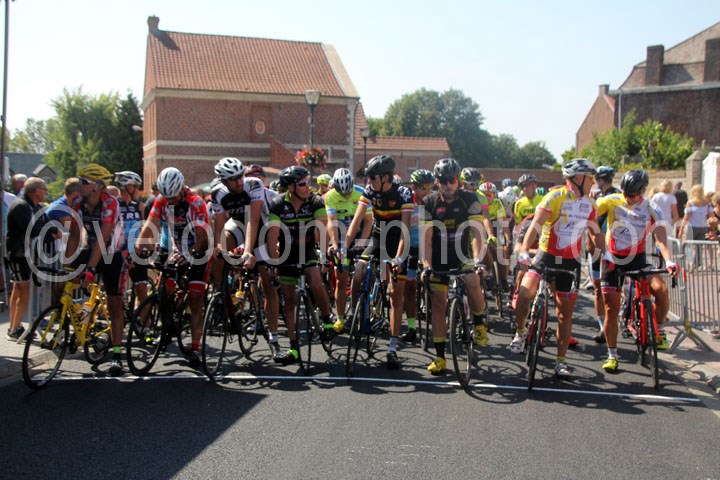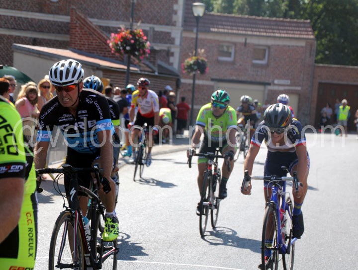 C’est encore un beau peloton de 3ème catégorie qui s’élança dans cette 2ème épreuve de la journée. Très vite, le peloton adopta un rythme très soutenu annonçant la grande bagarre dans les minutes qui allaient suivre. En effet, dans le 2ème tour les 1ères attaques voyaient le jour avec deux hommes aux commandes. A savoir Fabrice Caron ( Roeulx ) et Antoine Deruel ( Fourmies ). Le peloton était quant à lui à quelques encablures. Quelques minutes plus tard, la course redoublait encore en intensité avec un peloton qui se coupait en deux. Un petit groupe se dégageait à l’avant où l’on reconnaissait notamment David Dochniak ( CC Haveluy ) mais aussi Pascal Lecu ( VC Solesmes ). Le groupe de tête va rapidement prendre le large et ne sera plus revu par le peloton même si derrière on voyait un Gaetan Vanauberg ( BBL Hergnies ) très remuant. L’arrivée ne pouvait plus échapper aux hommes de tête. Et en costaud Cédric Lelong levait les mains pour la victoire même si c’est Orazio Ferro ( Camphin ) qui pensait remporter la victoire. Lelong s’imposait devant Antoine Deruel ( Fourmies ) et David Dochniak ( CC Haveluy ).