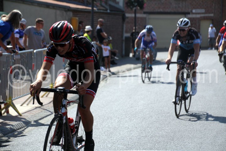 Finalement, c’est le dernier tour qui livrera ses derniers enseignements avec une belle accélération de Christophe Tachon ( St André ) qui va provoquer une cassure à l’avant de la course. On retrouvera alors 6 hommes pour ce final avec Christophe Tachon, Julien Blondiaux ( Cycling Thun Leveque ), Franck Basson ( Revo Race Bike ), Damien Delsaux ( Bousies ), Kevin Briand et Florian Lindaueur pour la Team Thourotte. Dans les derniers hectomètres de course, c’est le Team Thourotte qui fera le ménage en plaçant en orbite Florian Lindauer pour la victoire tandis qu’à l’arrière, Kévin Briand de la même équipe viendra assoir la domination de l’équipe en prenant une belle 2ème place en arrivant main dans la main avec son coéquipier. Quelques secondes plus tard, c’est Franck Basso qui viendra prendre une méritoire 3ème place. A noter la 13ème place du local du jour : Corentin Saintrain.