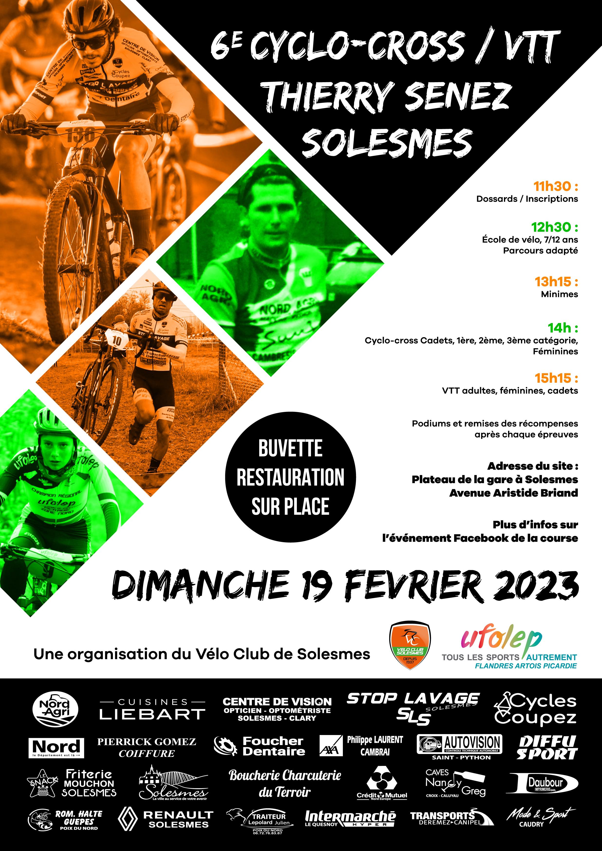 A 15 jours de la clôture de la saison hivernale, le très beau site du Plateau de la Gare à Solesmes accueillera la 6ème édition du cyclo cross VTT UFOLEP Thierry Senez à Solesmes. Le VC Solesmes a voulu rendre hommage à un ancien coureur de Solesmes et qui est décédé l’an dernier en donnant son nom à l’épreuve. Ce sera le 19 Février prochain. Les concurrents pourront se faire plaisir sur un parcours identique à celui de l’an dernier et qui promet du beau spectacle. Une belle organisation de nos amis du VC Solesmes autour du Président Antoine Plouchart. Une superbe après midi de sport qui s’annonce donc avec comme de coutume ce sont les écoles de cyclisme qui feront l’ouverture à 12 h 30 avant de clôturer de belle façon avec les vététistes à 15 h 15.