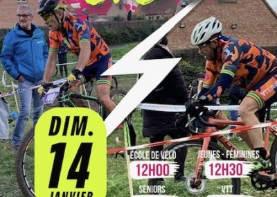 Le 14 Janvier prochain, le VTT Beuvry autour de Christophe Letombe vous attend pour le cyclo cross VTT de Beuvry sur un circuit qui sera modifié par rapport à l’année dernière avec un retour des deux cotés du canal sans oublier l’espace vert du coté de la Maison du Parc et bien sur le terril. Un superbe circuit dont on attend du très grand spectacle. Un bel événement qui débutera comme de coutume avec les écoles de cyclisme à 12 h 00 avant que les jeunes et féminines ne prennent part aux festivités du jour à 12 h 30. Ce sont ensuite les séniors 1ères, 2èmes et 3èmes catégories qui se lanceront dans la grande bagarre à 13h 45  avant une conclusion majestueuse avec les vététistes à 15 h 00. Alors le 14 Janvier, venez très nombreux pour du beau spectacle.