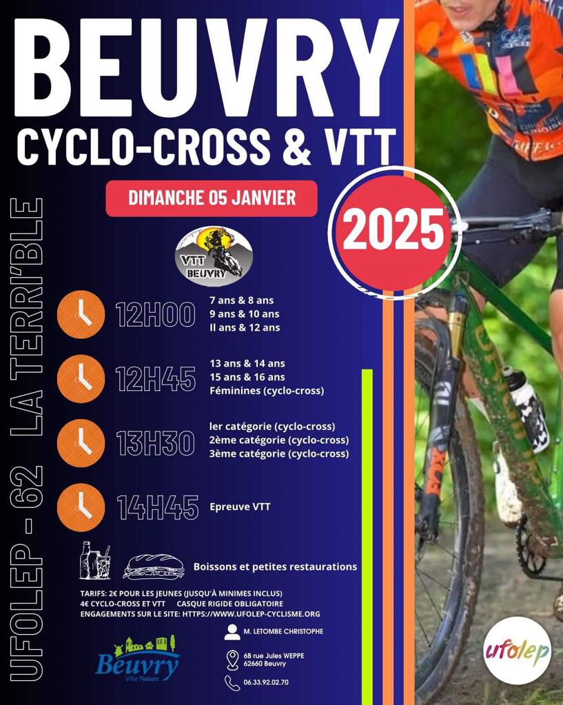 Le 05 Janvier prochain, le VTT Beuvry autour de Christophe Letombe vous attend pour le cyclo cross VTT de Beuvry sur un circuit qui sera modifié par rapport à l’année dernière avec un retour des deux cotés du canal sans oublier l’espace vert du coté de la Maison du Parc et bien sur le terril. Un superbe circuit dont on attend du très grand spectacle. Un bel événement qui débutera comme de coutume avec les écoles de cyclisme à 12 h 00 avant que les jeunes et féminines ne prennent part aux festivités du jour à 12 h 45. Ce sont ensuite les séniors 1ères, 2èmes et 3èmes catégories qui se lanceront dans la grande bagarre à 13h 30 avant une conclusion majestueuse avec les vététistes à 14 h 45 . Alors le 05 Janvier, venez très nombreux pour du beau spectacle.